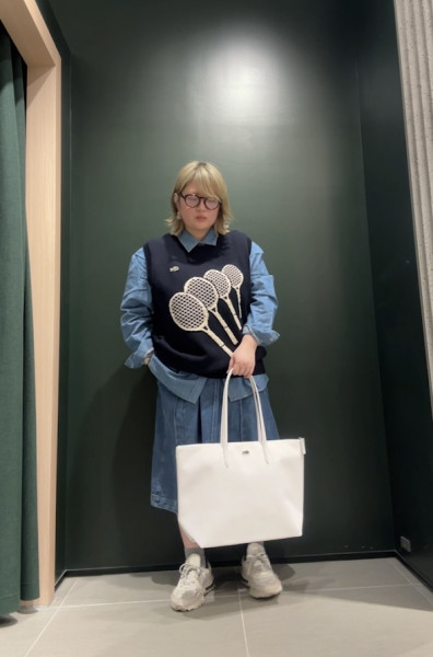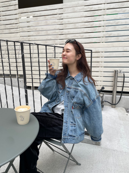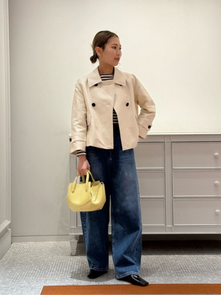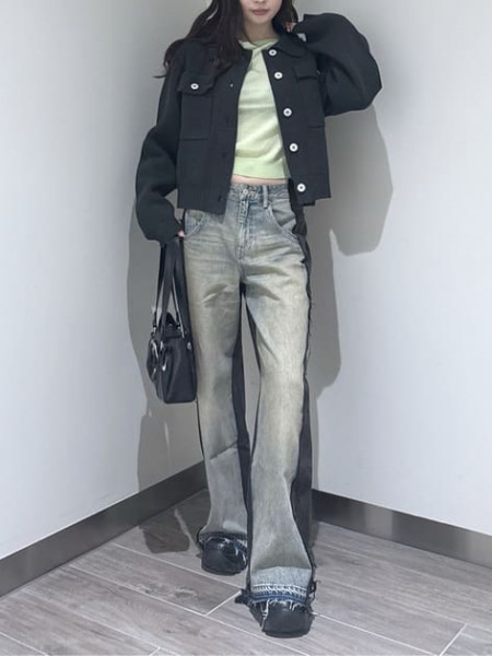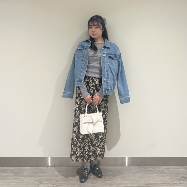お洒落なデニムジャケットを使ったコーデ。KUROKIのデニムを使ったジャケットで綺麗な色味です。スカー...