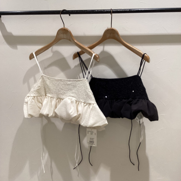 スパンコールバルーンビスチェcol.O.WHT/BLK ¥9,900異素材使いでふんわりと空気を含ん...