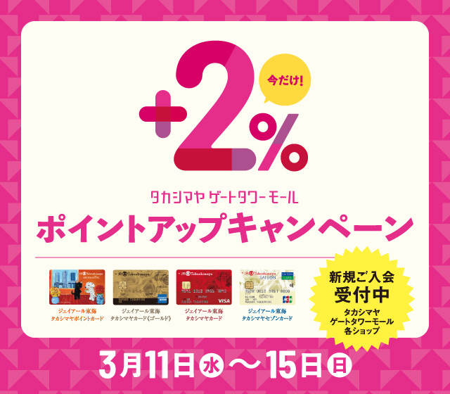 期間中、ジェイアール名古屋タカシマヤのカードを、タカシマヤ ゲートタワーモールでご利用いただくと、通常ポイントにプラス2%!