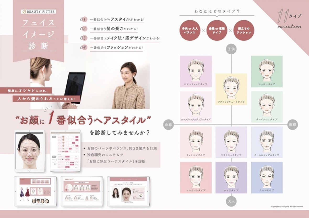 AI技術を用いてお顔のパーツや形状を計測し、お顔立ちの印象を11タイプに分類することで、「似合う」だけでなく、「なりたい」や「お好み」に近づくためにサポートします。