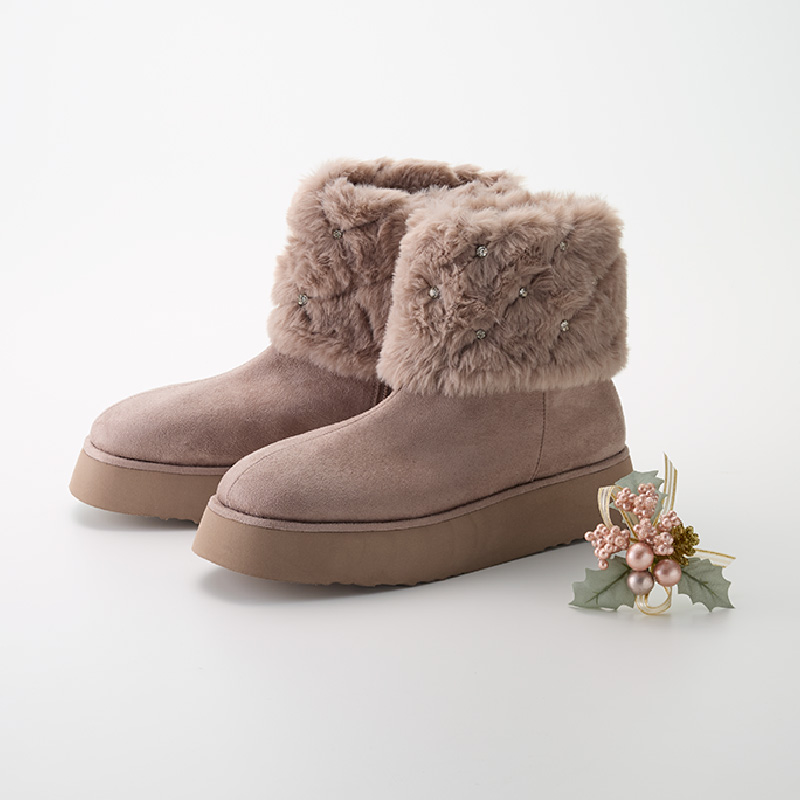 冬は毎日でも履きたくなるあたたかなムートンブーツ。煌めくビジューとキルティングデザインのファーが印象的!