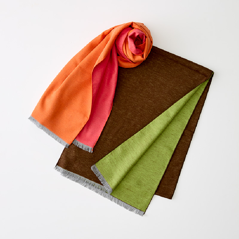 発色のよいカラーがコンビになったリバーシブルストール。シルク100%で季節を問わず長く使えて重宝します。