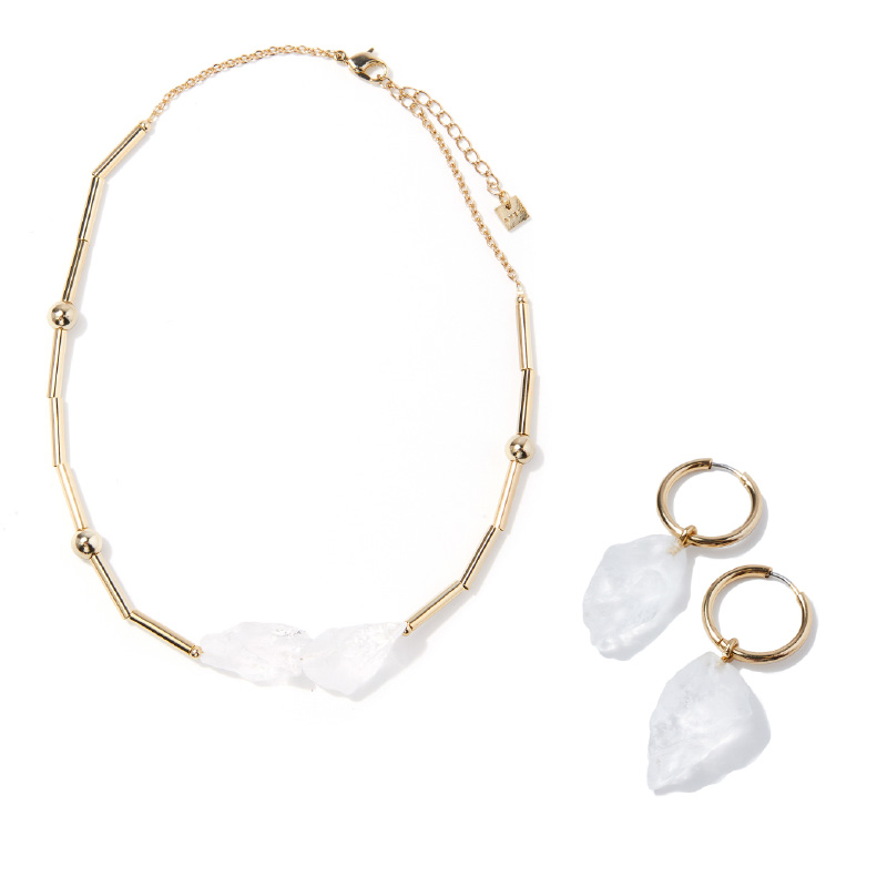 “ジュエリーアイス”という自然現象から生まれた氷のモチーフが胸元で輝くネックレスで、クールで斬新な印象をプラス。