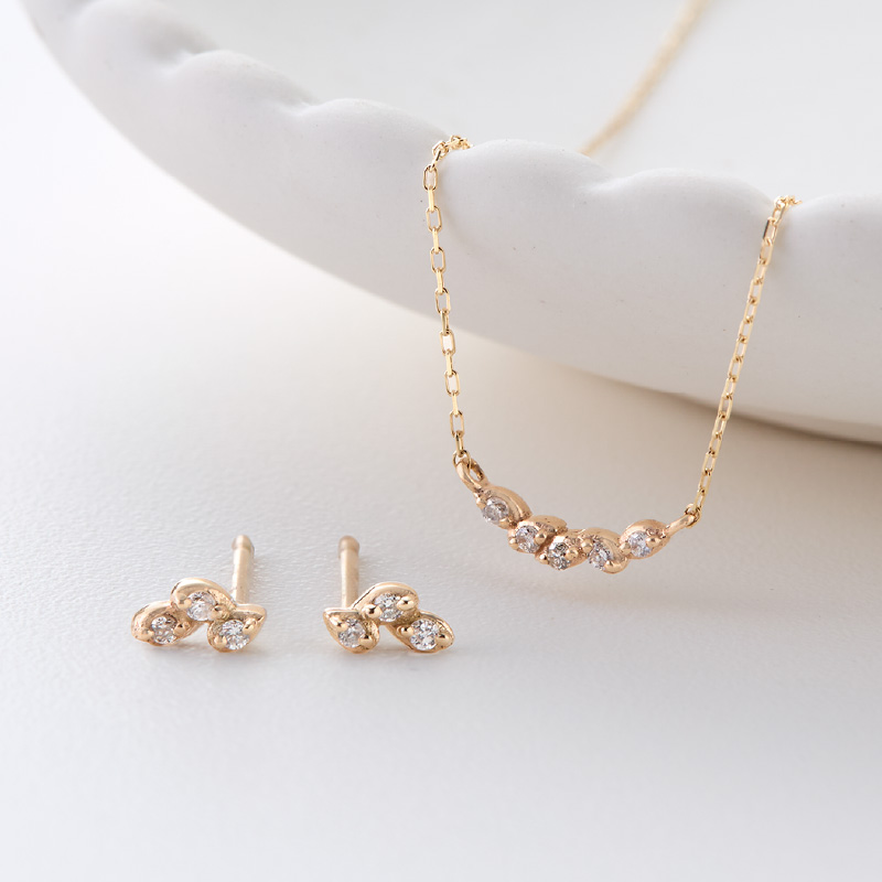 繊細なダイヤモンドをあしらったプチダイヤモンドシリーズ。ネックレスの胸元の緩やかなカーブがフェミニンな印象です。