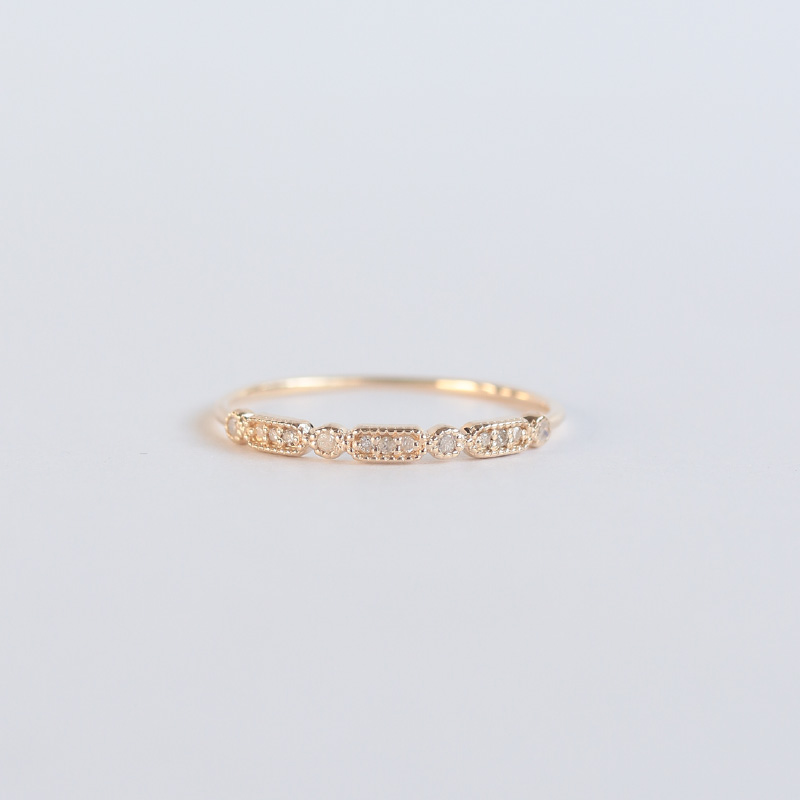 小粒のダイヤをゴールドが包み込むミルグレインデザイン。日常でも特別な日でも浮かずに程よい存在感を放ちます。