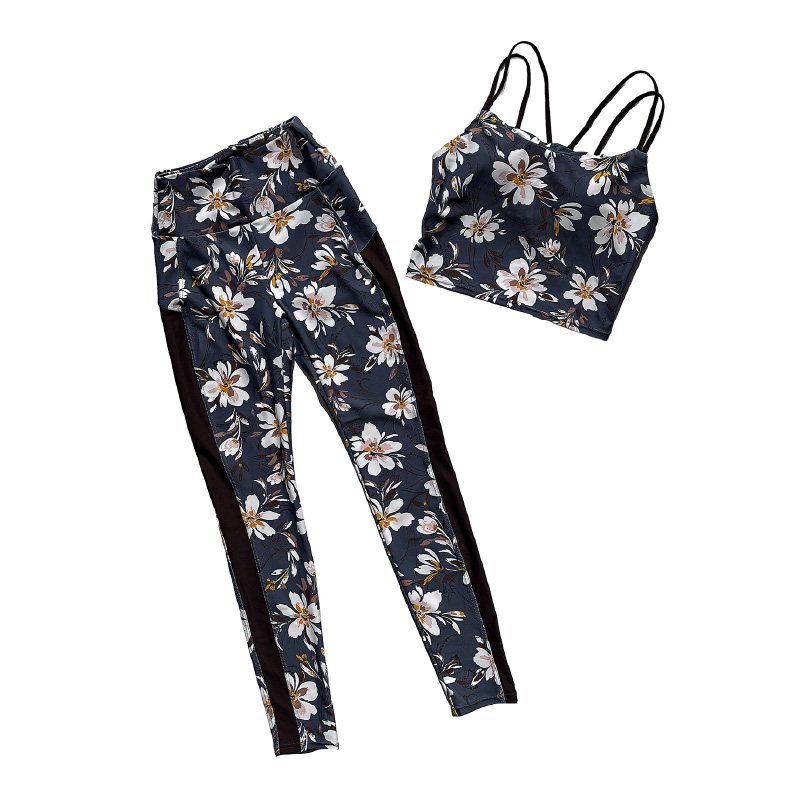 花柄のヨガウェアはストラップや切り替えでスタイルアップが実現。水陸両用なので、アクティブな人へのギフトにおすすめ。