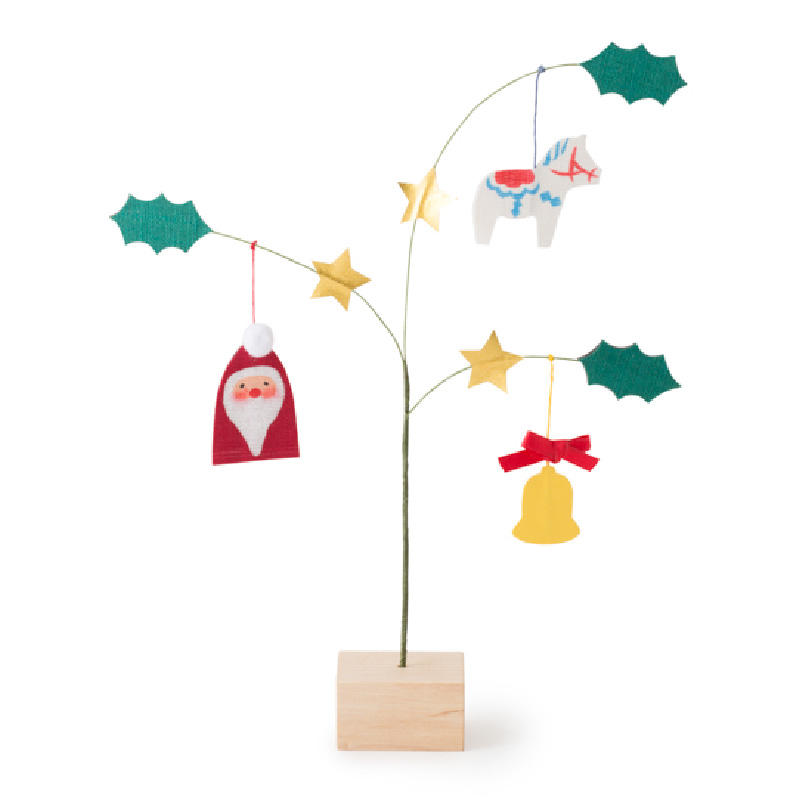 手積み手織り麻で作ったクリスマスのモチーフがあしらわれた卓上サイズのお飾り。オーナメントが優しく揺れる姿が楽しめます。