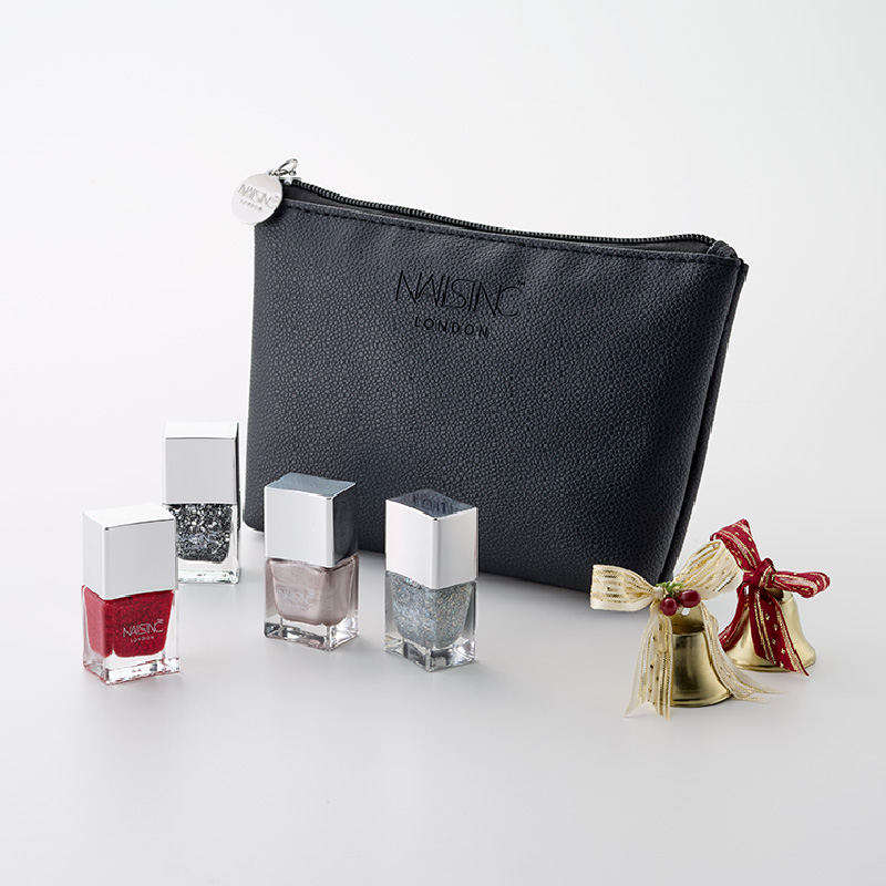 特別仕様のレザー調ポーチ付きミニネイルキット。ホリデーシーズンにぴったりなキラキラのネイルで幸せをお裾分け!