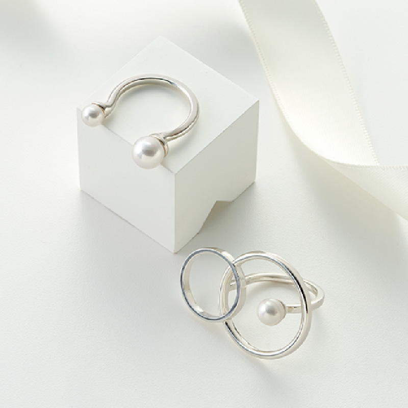 大小のパールとシルバーが描く大胆な曲線が印象的なリングセット。この冬だけの特別なジュエリーはギフトにもおすすめです。
