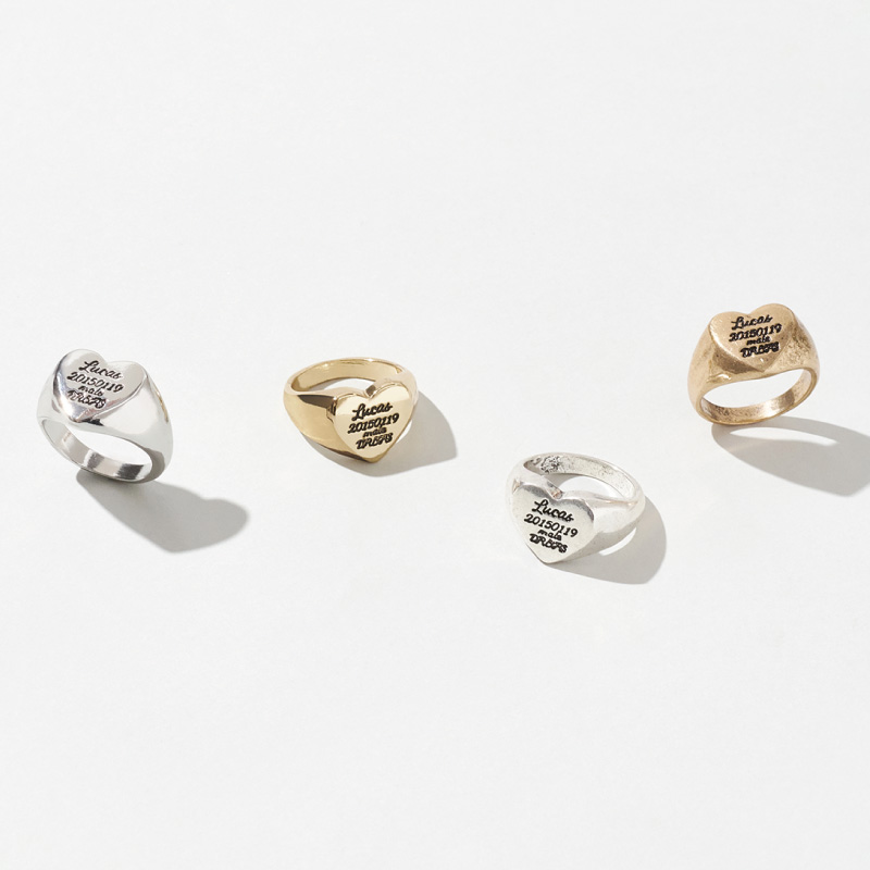 存在感抜群な大ぶりのハートに文字が刻まれたトレンド感のあるリング。友達と色違いにしてもかわいい♡