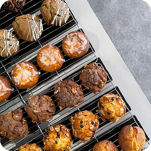 (カプリスベイク)すべて手作業で作り上げるマフィンはリッチで格別。当店自慢の定番マフィンをはじめ、ナッツやドライフルーツをたっぷり混ぜ込んだ冬季限定のシュトレンマフィンが並びます。